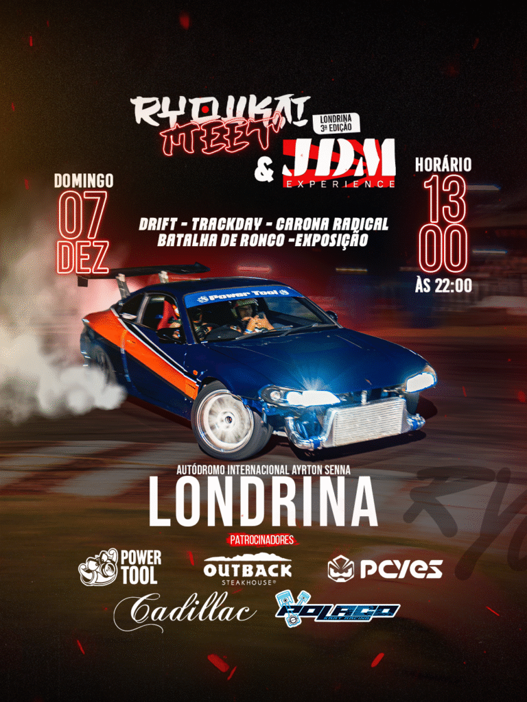 O Ryoukai Meet já é um sucesso e dessa vez teremos conosco a JDM Experience, um evento fantástico de carros de Curitiba! Nessa edição especial teremos: DRIFT, TRACKDAY, EXPOSIÇÃO, BATALHA DE RONCO, CARONA RADICAL e ÁREA VIP OPEN BAR.